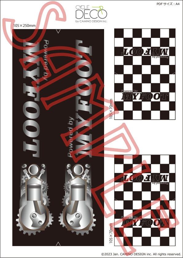 デフォルトでは「105×250mm」と「105×70mm」でデザインしてありますのでご自分の自転車のフレームサイズに合わせて拡縮してシール等にプリントし、カットしてから貼ってください。