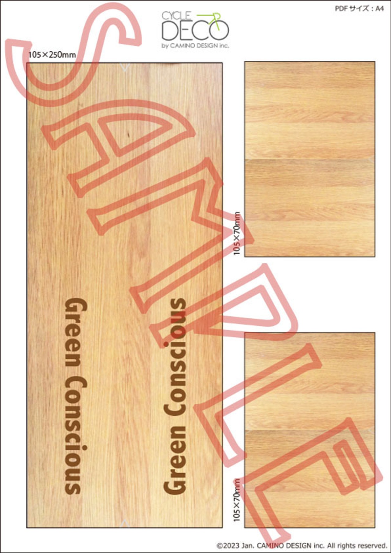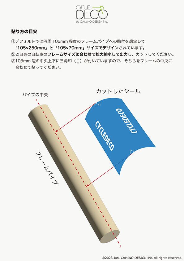 デフォルトでは「105×250mm」と「105×70mm」でデザインしてありますのでご自分の自転車のフレームサイズに合わせて拡縮してシール等にプリントし、カットしてから貼ってください。