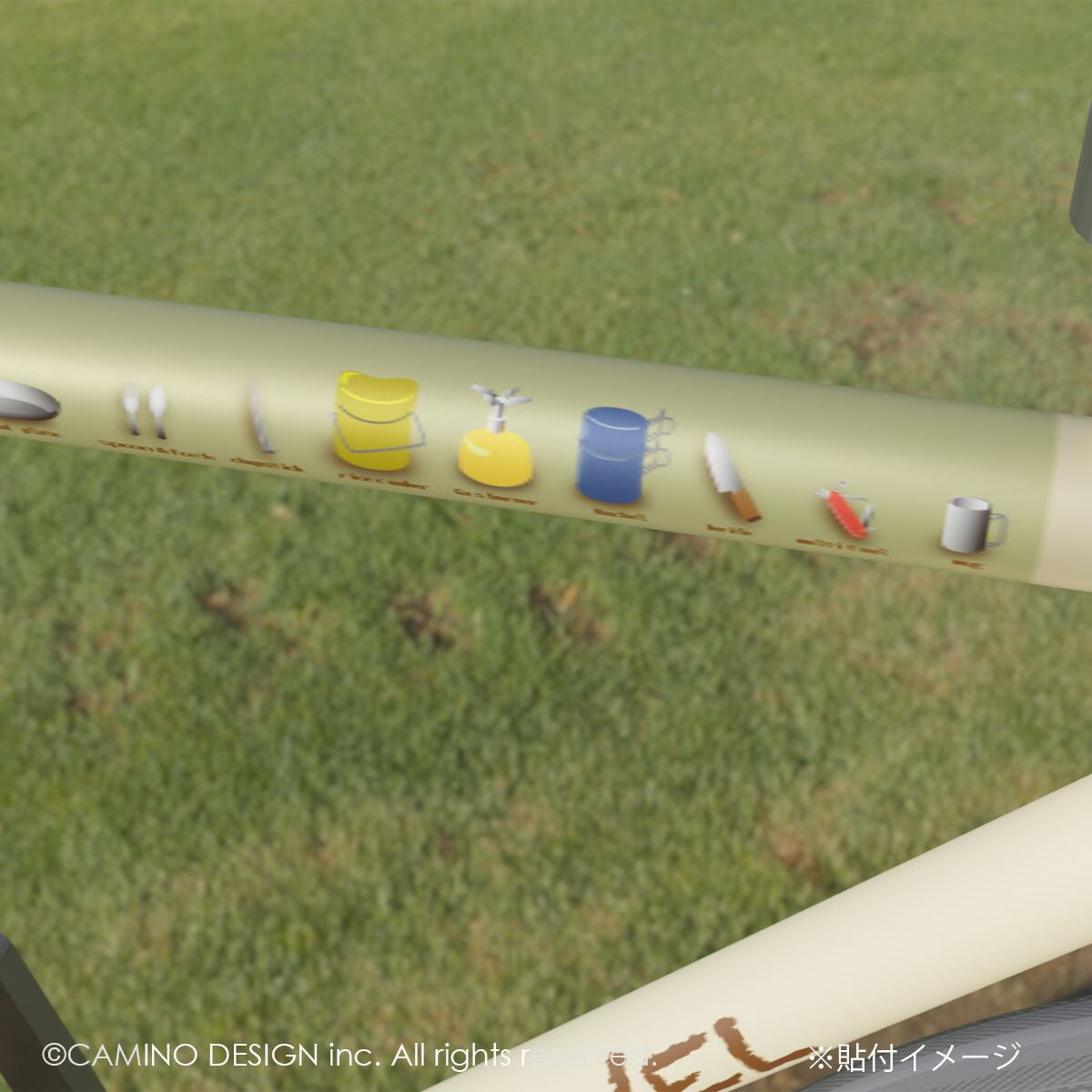 キャンプライド好きな皆さんに向けたデザイン。これさえあればキャンプ場でのクッキングは安心ではというツールをイラストに配しました。何を作るかはライダー次第。キャンプライドのお供にお楽しみください。